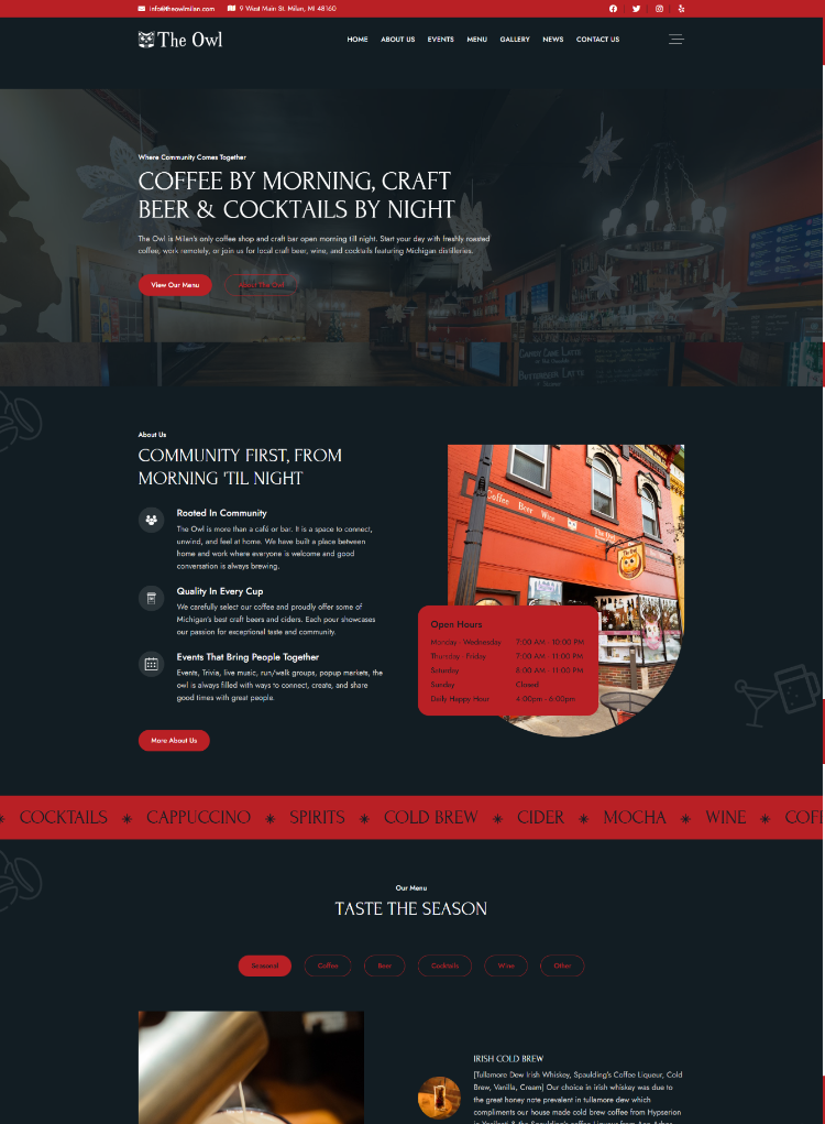 Back in 2016, we built a website for The Owl in Milan. Ryan Wilman, the owner and manager, needed something to represent his unique spot on West Main Street: a place that serves quality coffee by morning and craft beer and cocktails by night. That website served him well for years. But eight years is a long time in the digital world. The design started to feel dated. The photos didn't reflect what The Owl had become. The SEO wasn't keeping up. And maybe most importantly, Ryan couldn't update anything himself. Every time he wanted to change a menu item or add an event, he had to reach out to us. It was time for a redesign.